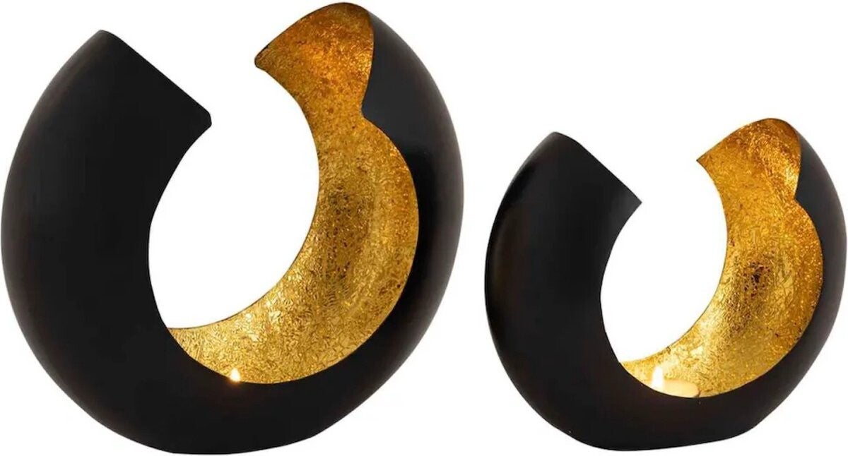 - Bijzonderheden: De artistiek vormgegeven theelichthouders zorgen voor gouden lichteffecten en een warme, gezellige sfeer in elke ruimte. De kandelaars zijn gemaakt van aluminium en zijn aan de buitenkant mat zwart geverfd en aan de binnenkant bekleed met goudfolie. De harmonieuze kandelaar set is handgemaakt en heeft daardoor kleine vormverschillen. Elk stuk is uniek! Deze kandelaars zijn ideaal als decoratie voor elke ruimte, maar ook als origineel verjaardags- of kerstcadeau.