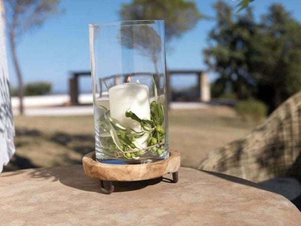 Een glazen vaas met een onderstel van hout wat goed past in een landelijk interieur