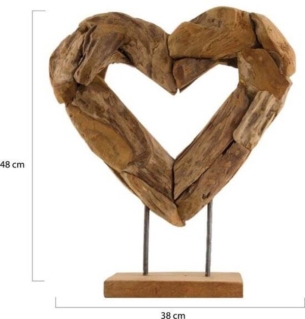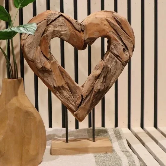 Decoratief teak houten hart op standaard (50x42x12 cm). Natuurlijk en stijlvol accent voor interieur of cadeau. Verkrijgbaar bij B-home Maldegem.