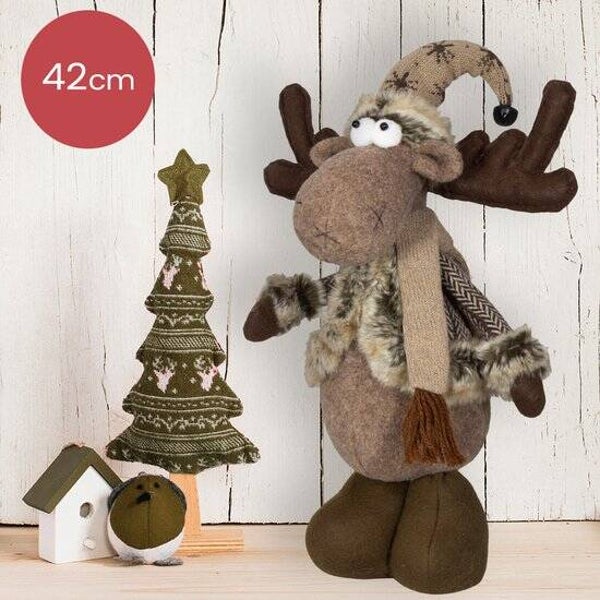 Geef je kerstinterieur een authentieke en stijlvolle touch met dit handgemaakte bruine rendier in een gestreept jasje, verstelbaar tot 52 cm!
