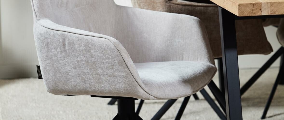 De Johnson is een comfortable eetkamer fauteuil op een draaivoet. Is verkrijgbaar in de kleuren BLUE - ECRU - SAND - GREY - ATRHRACITE.