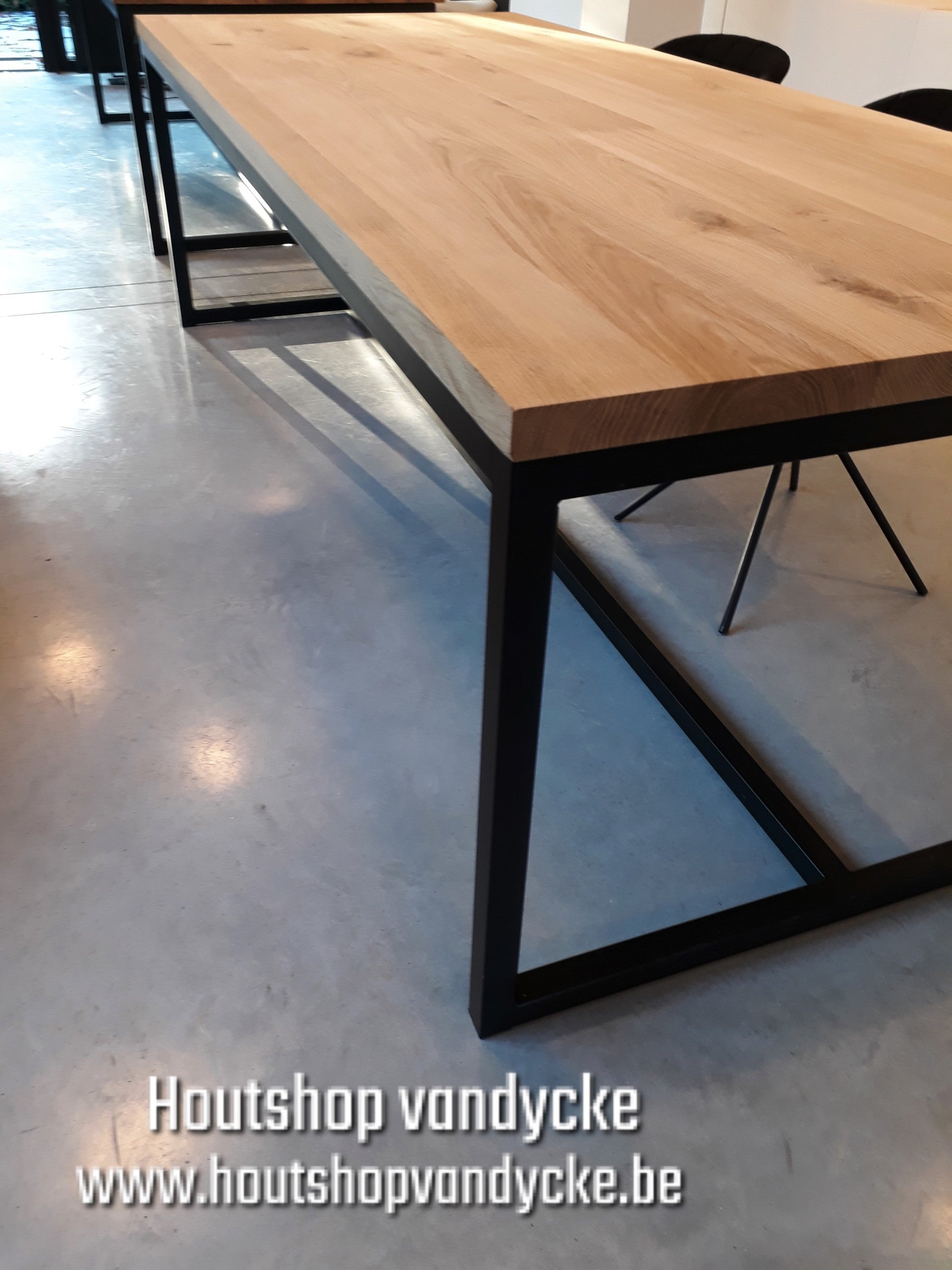 massief eiken tafelblad van 4 cm dik gemonteerd op een gelast stevig frame koker van 4 X 4 cm en gelakt