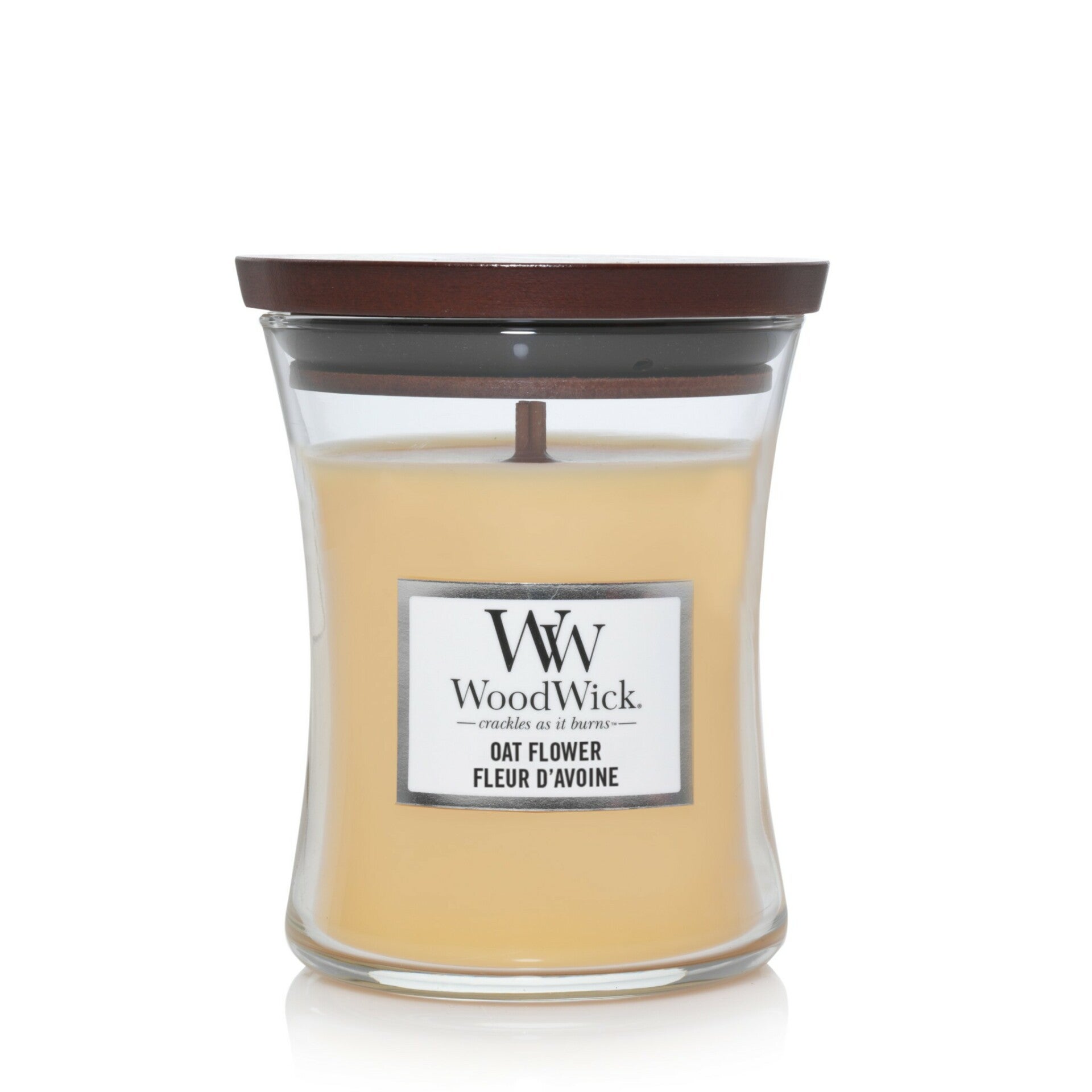Woodwick Oat Flower mengt rauwe honing met wilde haverbloem en kamille op een basis van een romige mix van amandelmelk en tonka.