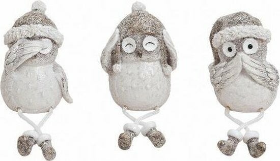 Winter- /kerstuiltjes, zittend met bungelende beentjes "Horen, Zien en Zwijgen". Bestaat uit een set van 3, voorzien van glitteruitstraling.