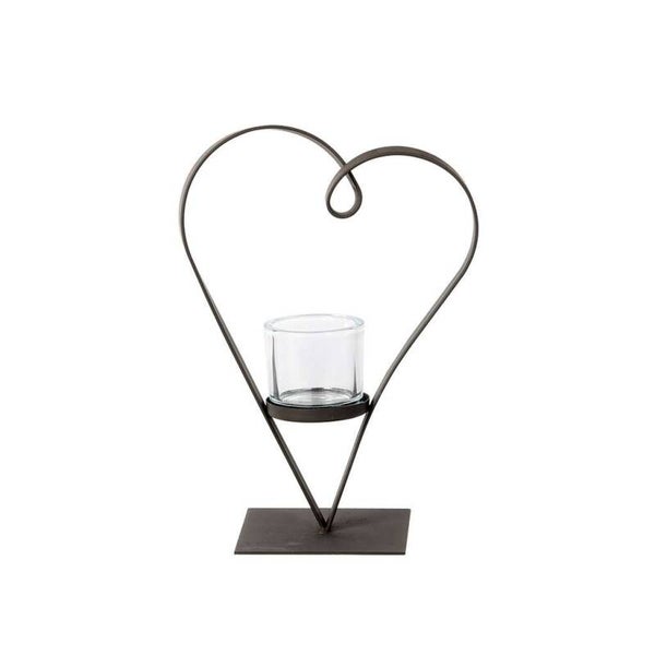 Het gebogen metalen hart is zwart geverfd en op een stabiele voet verwerkt. Een windlicht van dik glas is gezet. Mooi uit één stuk. Decoratief in het ensemble. Verkrijgbaar in twee maten