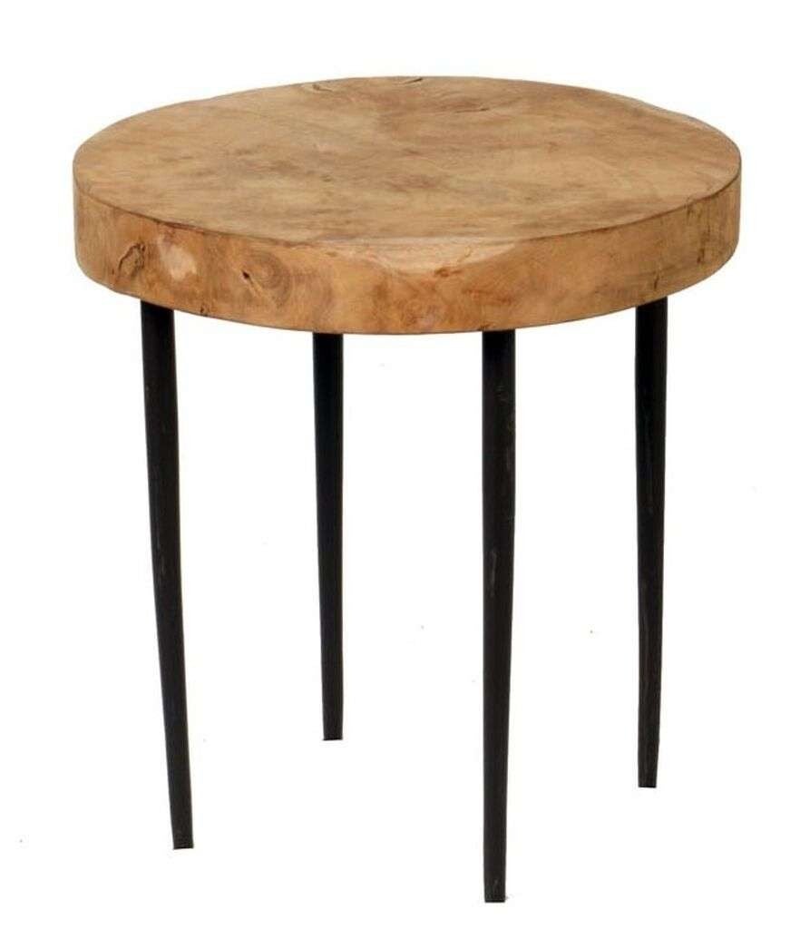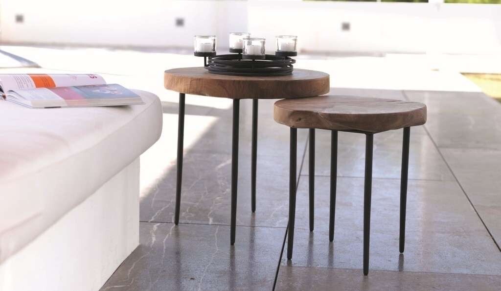 Deze stoere bijzettafel heeft een geheel eigen karakter. Het tafelblad is gemaakt van teakhout. De poten zijn van zwart gespoten metaal. De tafel is ook leuk te plaatsen als set van 2. Elk tafeltje heeft zijn eigen unieke vorm.