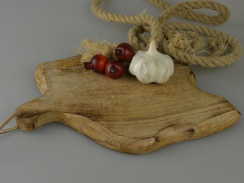 Duurzame, met olijfolie behandelde snij/ presentatie plank. De plank is gemaakt van stevig mango hout en heeft een robuuste, bourgondische uitstraling, mede door het ophangkoord en is zeer milieuvriendelijk.