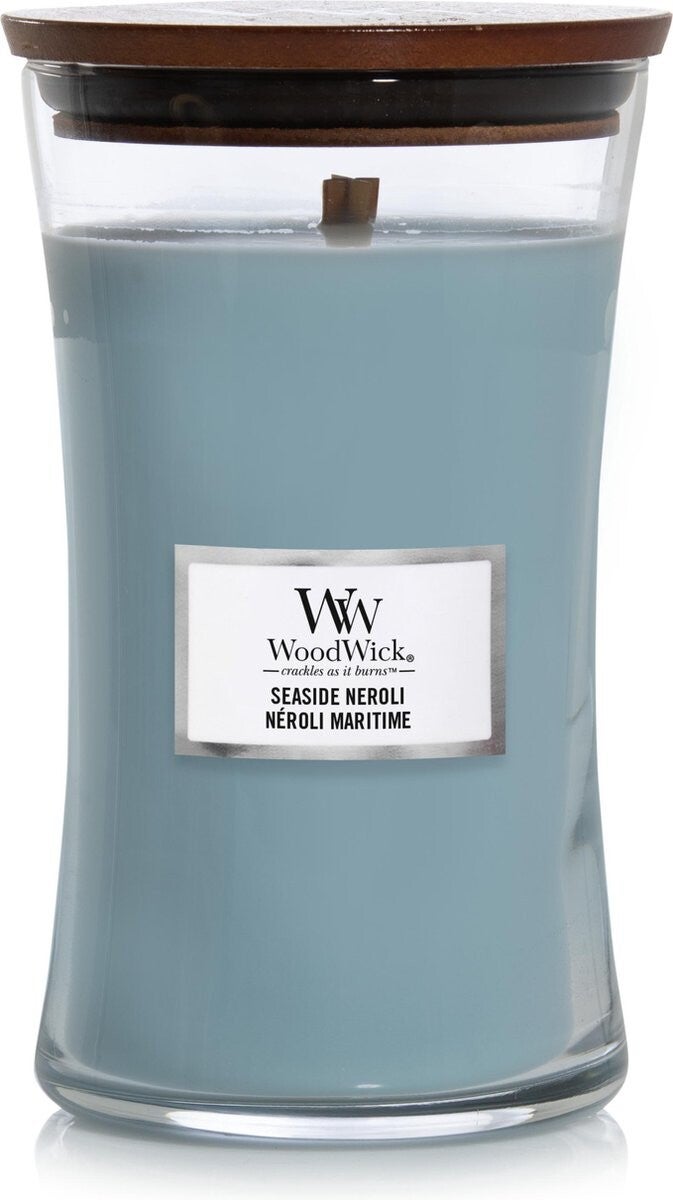 Woodwick Seaside Neroli brengt een frisse zeebries van drijfhout en waterlelie-tonen, met de gezoete geur van neroli-bloesem en pittige mandarijn in je huis.