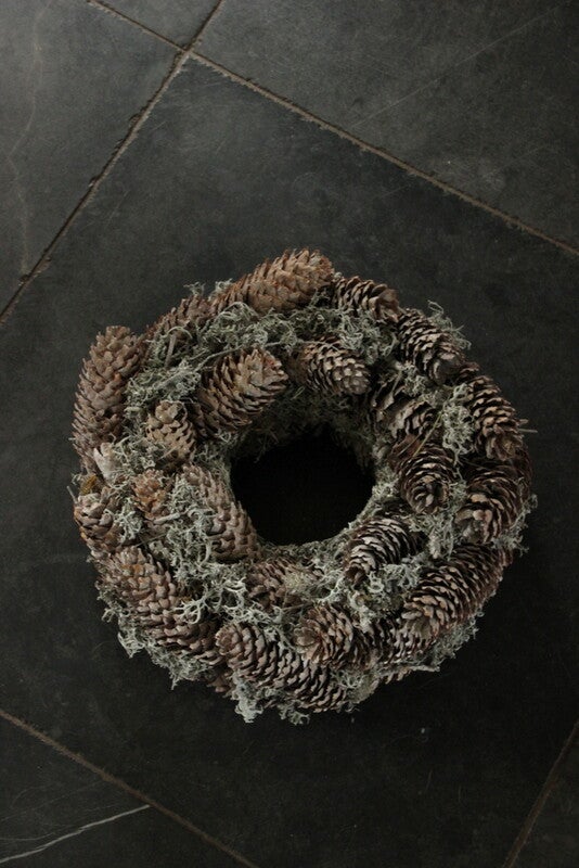 Een krans van bommos/fijnspar met een licht white wash laagje er overheen.De krans heeft een diameter van 30 @ 35 cm