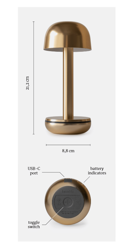 De Two Gold is een bescheiden lamp met uiterst doordacht design, de Two is tevens de eerste kwaliteits lamp op batterijen die ook echt iets toevoegd aan de sfeer in uw leefomgeving. De Two is vooral uniek omdat deze op een volle lading tot 140 uur licht produceert. Laad de lamp makkelijk op via een kabel of draadloos op een draadloze oplader, hiervoor hebben we ook een bijpassend oplaadstation. De Humble is inclusief ingebouwd Led-paneel. De afmeting is 8,8 cm diameter en is 21,2 cm hoog.