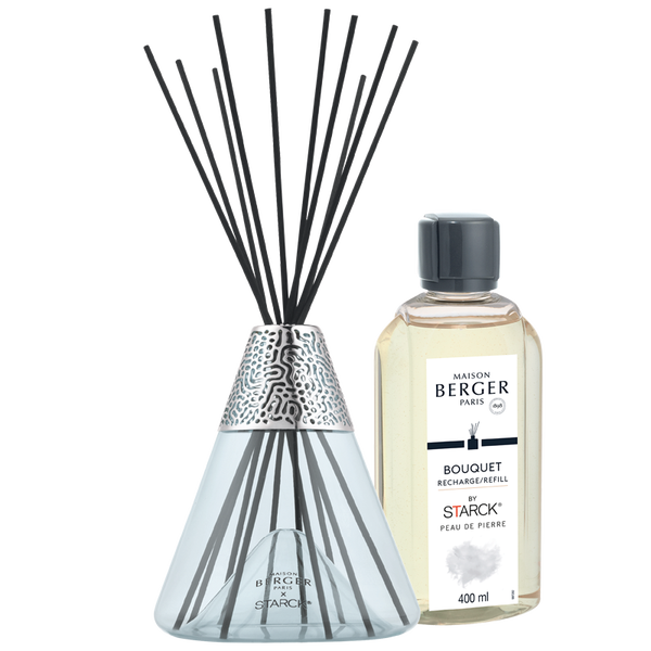 De parfumverspreider by Starck Peau de Pierre zijn atypisch, net als de ontwerper die zijn naam en talent heeft verleend aan verschillende creaties die het resultaat zijn van zijn samenwerking met Maison Berger Paris. De tijdloze lijnen en de eenvoudige, strakke vorm maken dit alledaagse voorwerp tot een icoon. Het is esthetisch geïnspireerd door laboratoriumglaswerk, wat de creatie ervan een echte finesse geeft. De body van de parfumverspreider is duidelijk herkenbaar en aan de bovenkant versierd met een metalen ring met organische motieven en moleculaire codes. Het geheim van de originaliteit van de parfumverspreider by Starck Peau de Pierre ligt in zijn gewelfde, gestikte en gezeefdrukte voet. De grijze kleur geeft het die extra etherische elegantie, gebruikt als verwijzing naar de verpakking van het persoonlijke parfum Peau de Pierre. Herken de pittige intensiteit van bergamot gecombineerd met de bloemige geur van jasmijn besprenkeld met enkele kruidige en muskusachtige accenten in deze tot huisparfum omgevormde geur. Deze mannelijke parfumcompositie speelt met ambiguïteit en bevestigt tegelijkertijd de vrouwelijke kant.